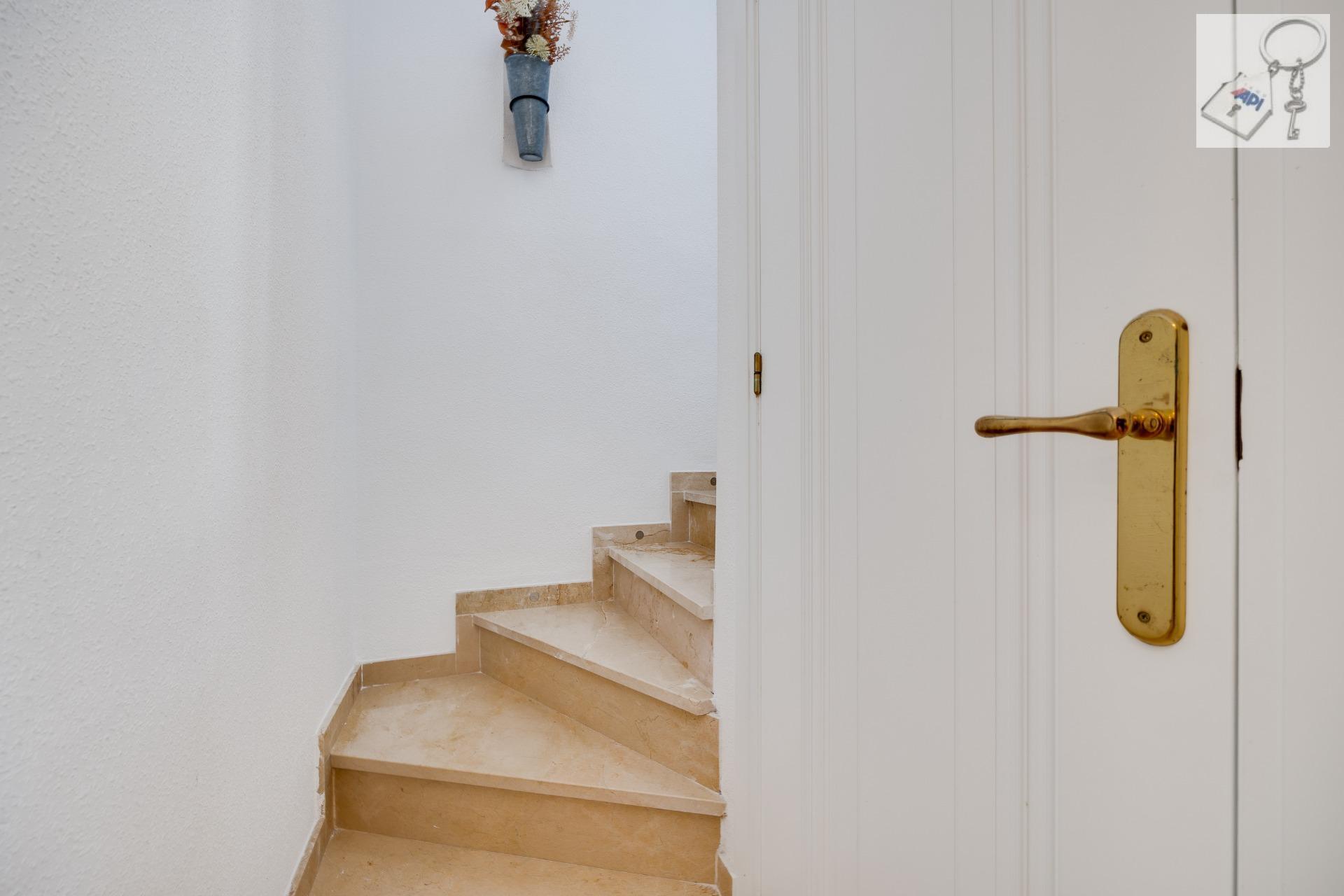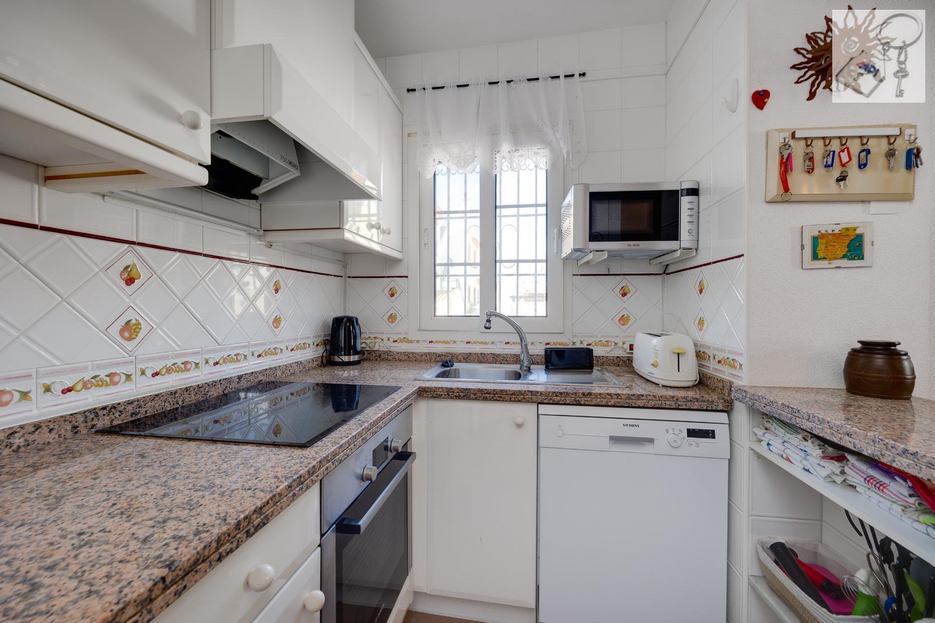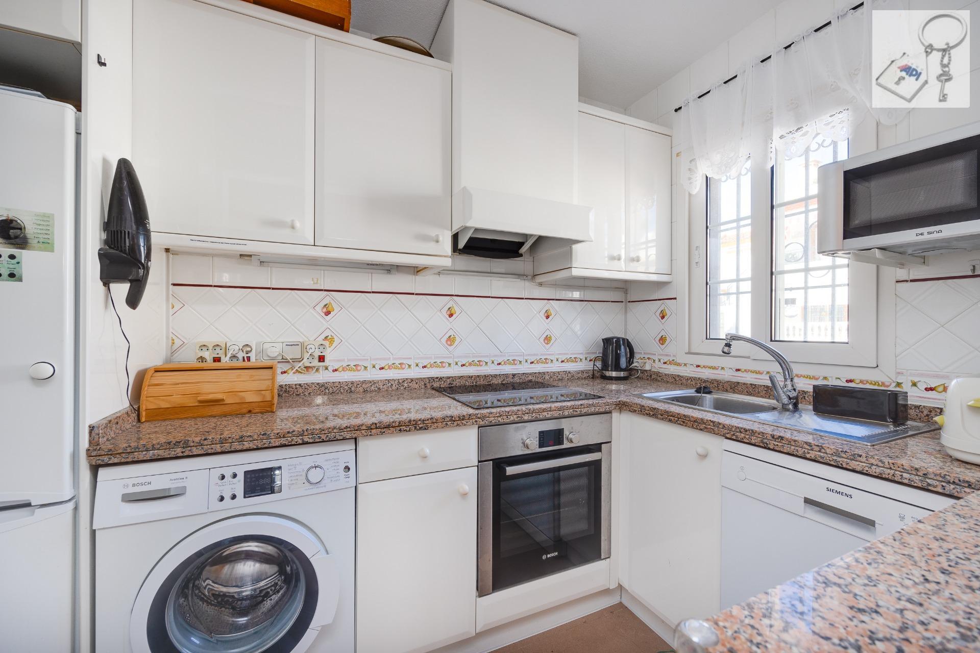 Introducing a fantastic opportunity to own this charming corner townhouse styled as a quad, located on the highly sought-after Calle Niagara in Playa Flamenca. This property has everything you need to transform it into your dream holiday home in Spain! The spacious plot features a beautiful garden with plants and ample space for secure parking under a pergola, providing shelter from both sun and rain—a true convenience. ☀️????️~~Upon entering the home, you'll find an inviting porch leading inside where there’s an expansive living room equipped with air conditioning and cozy fireplace—perfect for relaxation.~The open kitchen is bathed in natural light thanks to multiple windows that allow easy ventilation; plus, all appliances are relatively new BOSCH brand items. On this floor, you will also discover two generous double bedrooms along with one large bathroom.~Heading upstairs leads you to another double bedroom complete with its own full bathroom—and don’t miss out on accessing the stunning private solarium measuring 30 m² offering plenty of sunshine ????☀️and unobstructed views!~This residence is nestled within an exceptional community featuring a wonderful swimming pool ????♂️for residents’ enjoyment!~Moreover, its prime location means you're just minutes away by foot (10-minute walk) from essential amenities—including schools ????????supermarkets ????bars & restaurants—all while being conveniently close (also about 10-minutes walking distance!)to La Mosca commercial center or Zenia Boulevard shopping mall ????????~Don’t let this incredible opportunity pass—you must seize it today!~