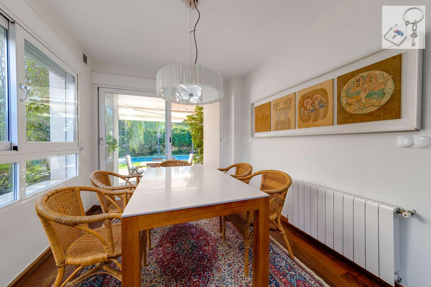 En la planta principal podemos disfrutar el salón en dos alturas con acceso a zona de piscina y jardin.